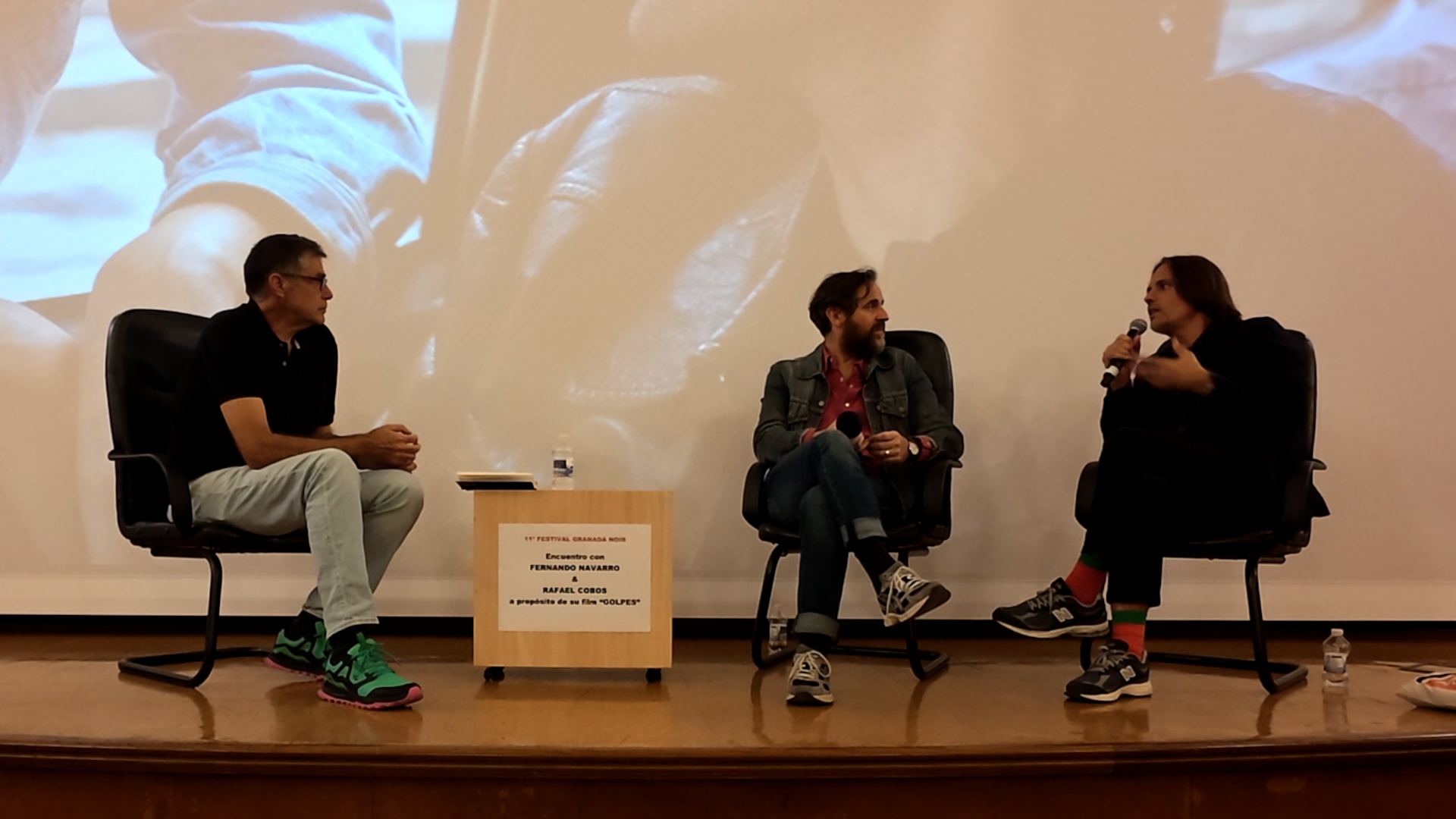 El guionista y director Rafael Cobos y el guionista y novelista Fernando Navarro en conversación con Jesús Lens